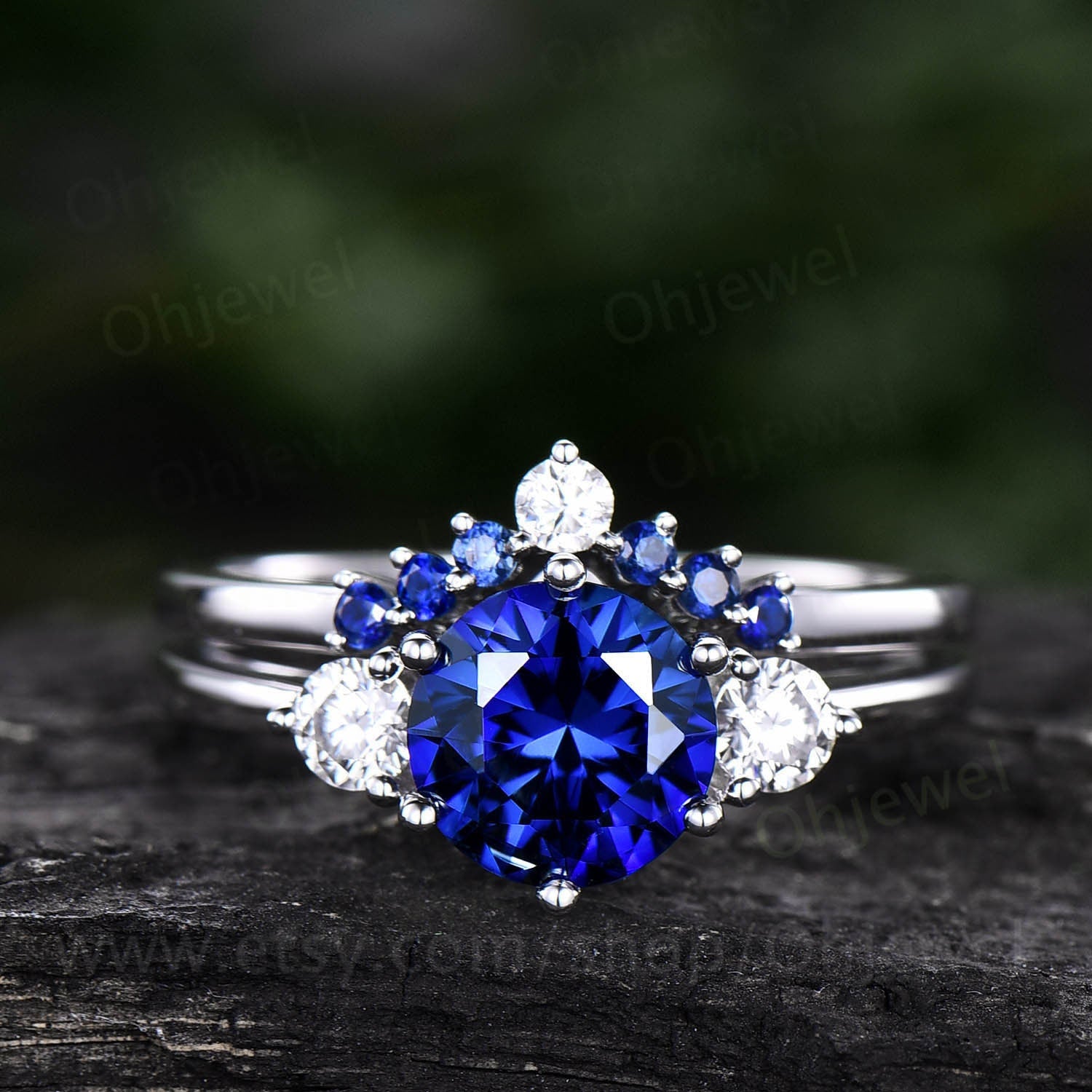 Vintage unique blue sapphire engagement ring set 14k rose gold three stone moissanite ring minimalist bridal wedding ring set for women gift
