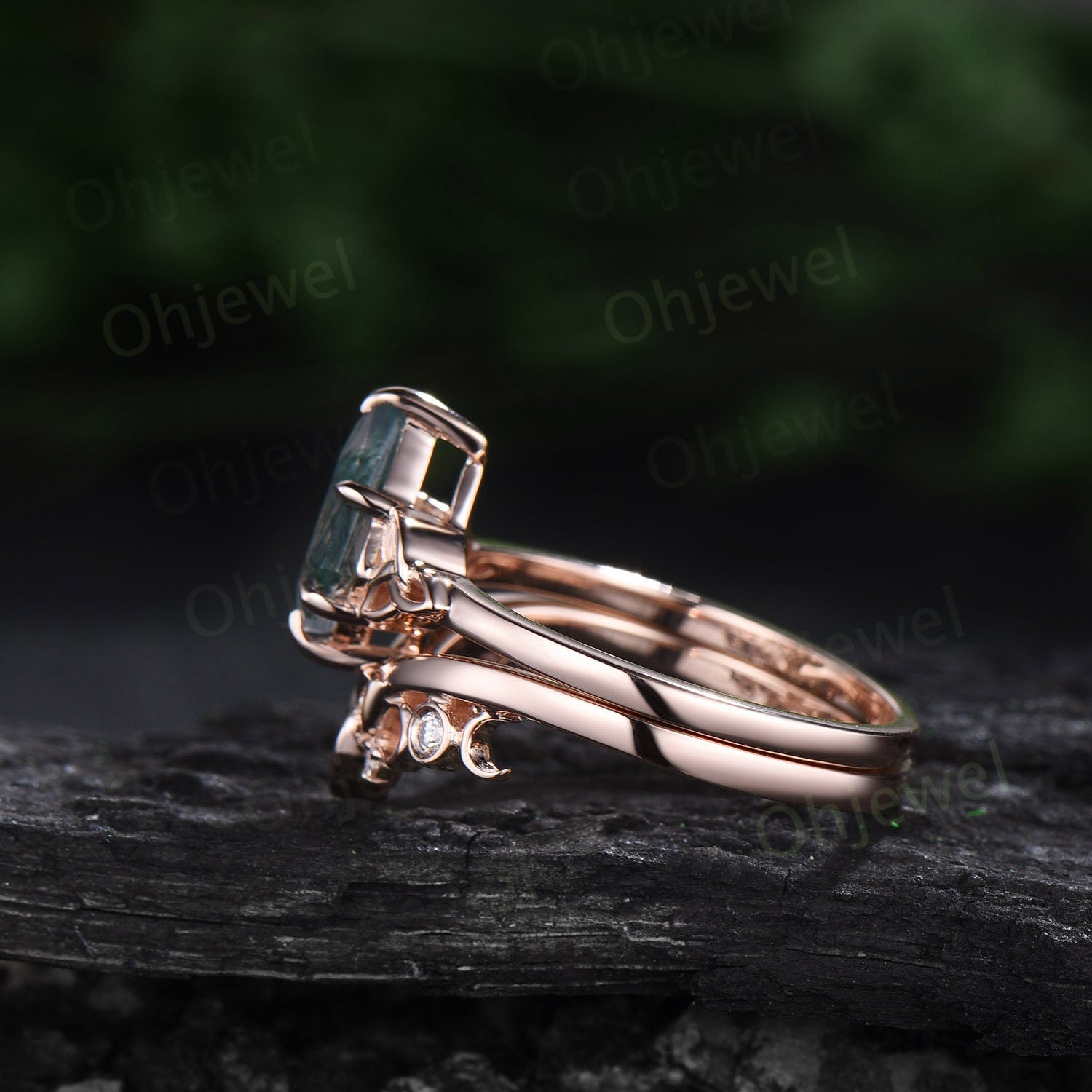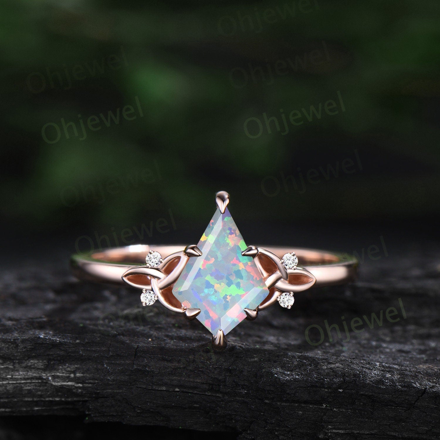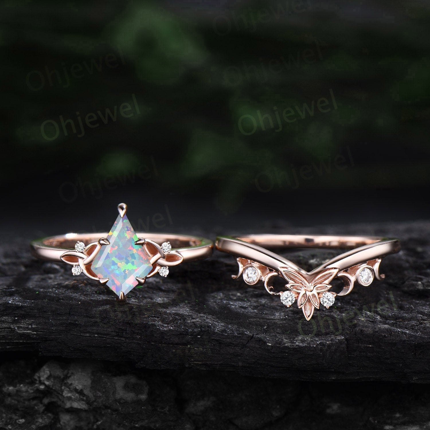 White opal ring women vintage Kite cut opal engagement ring Celtic Knot rose gold five stone cluster diamond ring unique promise ring set